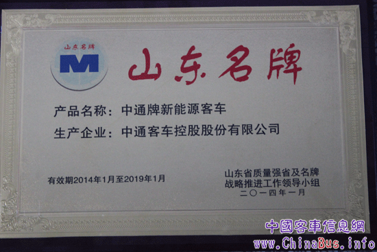 中通客車為深入實施名牌戰(zhàn)略,提升企業(yè)質(zhì)量競爭力,2013年積極響應質(zhì)量強省建設,扎實開展“品牌建設年”活動,通過材料公示、資格審查、專家評價、評價軟件自動評分、預選名單公示、省質(zhì)量強省及名牌戰(zhàn)略推進工作領導小組審議等評審程序,中通新能源客車被評為2013年山東省名牌產(chǎn)品稱號。