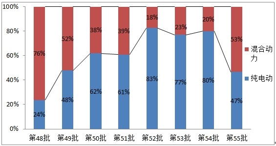 大智慧通訊社梳理最近八批的工信部《節(jié)能與新能源汽車(chē)示范推廣應(yīng)用工程推薦車(chē)型目錄》,也進(jìn)一步佐證了上述觀(guān)點(diǎn),國(guó)內(nèi)車(chē)企新能源汽車(chē)的車(chē)型開(kāi)發(fā)主集中在純電動(dòng)汽車(chē)方面(備注:第55批目錄中混合動(dòng)力占比超50%,主要是企業(yè)預(yù)期混合動(dòng)力客車(chē)補(bǔ)貼政策將出,金龍客車(chē)、廣汽集團(tuán)等車(chē)企集中上報(bào)混合動(dòng)力客車(chē)車(chē)型引起)。