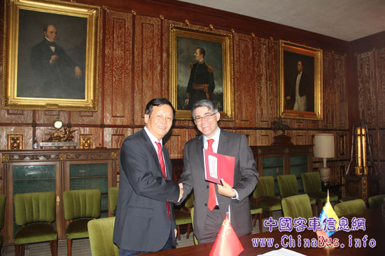 湯玉祥與委內(nèi)瑞拉交通部長海曼.特魯?shù)偈鹪诋?dāng)?shù)睾腺Y建設(shè)客車工廠的框架協(xié)議