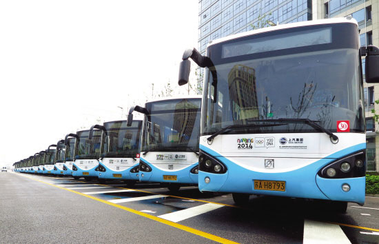 中國江蘇網(wǎng)8月4日訊 南京公交集團為南京青奧會提供900輛新能源客車,這些新能源客車將在8月16日開幕前全部到位,作為本屆青奧會期間聯(lián)通各個會場的公共交通工具。圖為第一批交付的新能源公交車整裝待發(fā)。