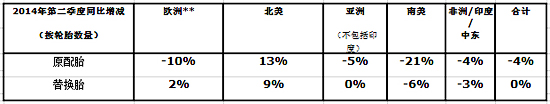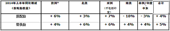 亞洲(不包括印度)的總體子午線和斜交輪胎需求增長4%。由于經(jīng)濟降溫,中國市場上半年最終取得6%的增長,但是第二季度顯著放緩。在東南亞,受增長極為強勁的2013年上半年對比基數(shù)和泰國政治危機影響,原配胎市場重挫23%。在日本,強勢日元推動的卡車出口促使原配胎需求增長21%。