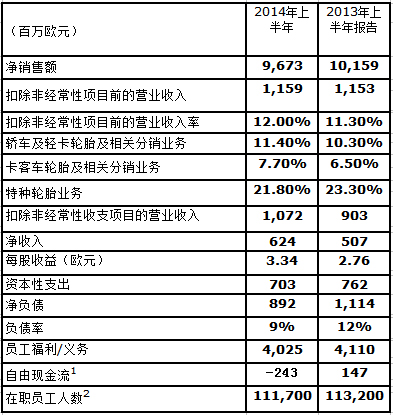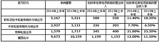 轎車及輕卡輪胎和相關(guān)分銷業(yè)務(wù)的凈銷售額從2013年上半年的53.21億歐元下滑至51.67億歐元,但是在排除不利的貨幣效應(yīng)后,同比增長1.1%。
