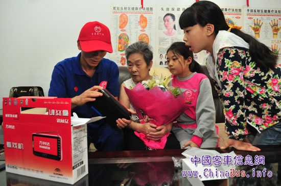 59位宇通愛心使者身著宇通工裝,分為8組全體出動(dòng),每一支小組都帶著精美的禮物和真誠的祝愿奔赴員工長輩的家中,在這些隊(duì)伍里,還有4位可愛的小天使——他們是宇通員工的孩子。活潑可愛的小天使蹦蹦跳跳地在前面帶路,年輕的志愿者拎著大包小包的禮物快步跟隨其后。敲開員工長輩家門的一刻,志愿者們向老人們說明了來意,老人們看到眼前的志愿者和孩子們,笑容像花朵綻放在臉上。小天使們有的為長輩們送上自己畫的畫、有的表演歌舞,還有的用稚嫩的聲音為爺爺奶奶們讀起了集團(tuán)總裁湯玉祥寫給員工家屬的節(jié)日賀信:“宇通所取得的成績源于廣大宇通人的辛勤努力和敬業(yè)奉獻(xiàn),而家屬們的有力支持和深情付出更構(gòu)筑了我們的堅(jiān)實(shí)后盾。在追求企業(yè)發(fā)展的同時(shí),宇通非常注重文化建設(shè)和弘揚(yáng)中華傳統(tǒng)美德,不僅要給員工提供良好的事業(yè)成長平臺,更要培養(yǎng)其高尚的道德品格,不辜負(fù)你們對公司的信賴和重托?!?/P>
