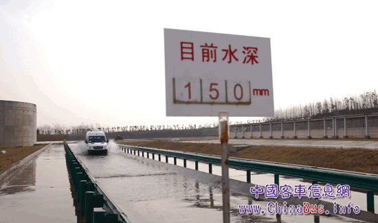 狀態(tài)一:海格6米純電動(dòng)輕客駛?cè)胨?5cm的涉水池,以30km/時(shí)的速度勻速行駛,要求有效時(shí)間10分鐘內(nèi)通過。海格6米純電動(dòng)輕客按要求準(zhǔn)確無誤完成該試驗(yàn)狀態(tài)。