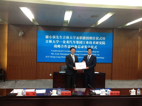 簽約儀式之前,李元元校長為吉林大學(xué)杰出校友、金龍汽車集團(tuán)廉小強(qiáng)董事長頒發(fā)了吉林大學(xué)兼職教授聘書。