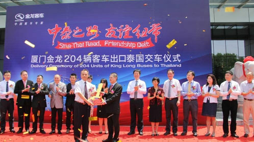 正值中泰建交40周年之際,2015年6月12日一場主題為“中泰之路 友誼紐帶”的隆重交車儀式在大金龍廈門廠區(qū)圓滿舉行。泰國旅游業(yè)某巨頭董事長從大金龍執(zhí)行副總經(jīng)理張斌手中接過金鑰匙,在多家媒體的見證下,完成了2015年國內(nèi)出口泰國單批最大旅游訂單——204輛12米金龍豪華大巴的交付。