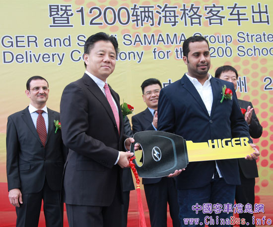 10月30日上午,“一帶一路海格同行”--海格客車(chē)與沙特客戶(hù)戰(zhàn)略協(xié)議簽署暨1200輛客車(chē)交車(chē)儀式在蘇州工業(yè)園區(qū)海格客車(chē)生產(chǎn)基地隆重舉行。蘇州工業(yè)園區(qū)管委會(huì)主任楊知評(píng)向海格客車(chē)沙特客戶(hù)代表遞交了金鑰匙。蘇州金龍海格客車(chē)總經(jīng)理吳文文與沙特薩瑪瑪集團(tuán)CEO艾哈邁德簽署戰(zhàn)略合作協(xié)議。