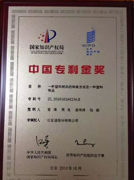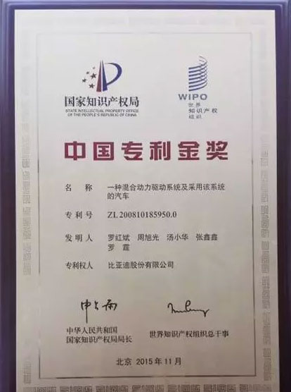 2015年12月15日,第十七屆中國專利獎頒獎大會在京隆重舉行。比亞迪股份有限公司(簡稱比亞迪)憑借“混合動力專利技術”斬獲中國專利金獎,成為第一個在新能源領域得此殊榮的汽車廠商。捷報不止于此,比亞迪還另有三項專利獲得優(yōu)秀獎,分別是秦外觀設計專利、電動汽車電池專利技術、儲能系統(tǒng)專利技術。