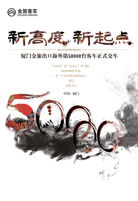 2015年11月30日上午,廈門金旅海滄基地內(nèi)比往日熱鬧許多,廈門金旅第5萬輛客車出口海外發(fā)車慶典暨以色列137輛歐Ⅵ公交車交接車儀式正在舉行。一排藍白相間掛著紅花的公交車靜靜地等待著發(fā)車的指令,會場臨時搭建的舞臺前碩大的“50000”數(shù)字,醒目而富有感染力。簡短的儀式過后,在人們的注視下,車輛緩緩駛出海滄基地的大門,這批車輛同時也讓金旅客車的出口數(shù)字突破5萬輛。截至目前,國內(nèi)客車行業(yè)出口數(shù)量達到5萬輛的企業(yè)還屈指可數(shù)。