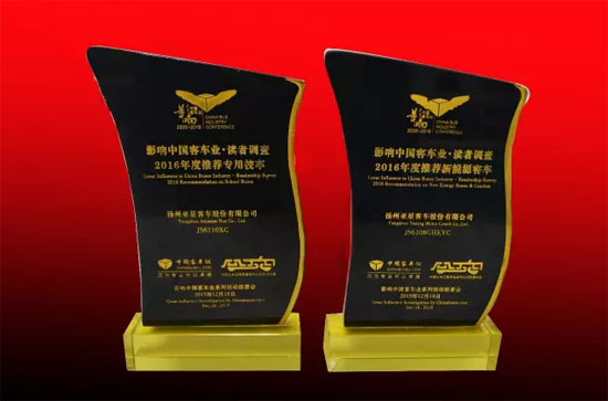 2015年12月18號,“第十屆影響中國客車業(yè)系列活動”在北京隆重召開,本次活動的重頭戲便是頒獎典禮的召開,最終亞星客車榮獲“2016年度推薦新能源客車”和“2016年度推薦專用校車”兩項(xiàng)大獎。