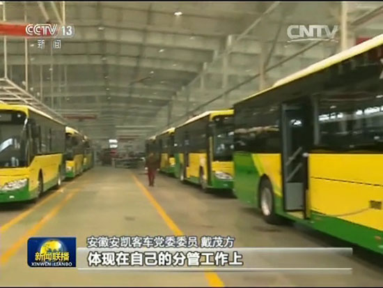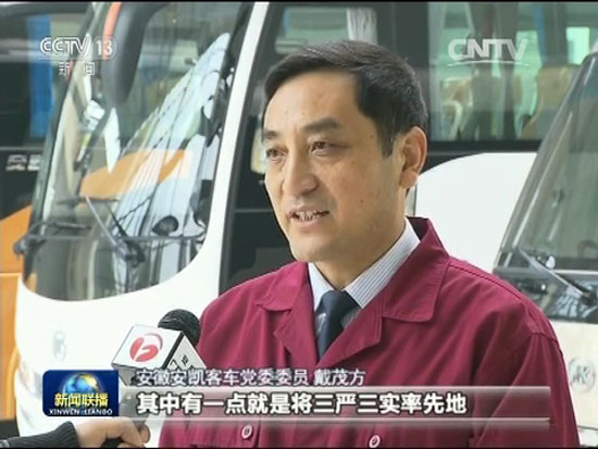 12月30日,中央電視臺《新聞聯(lián)播》就28日至29日習近平總書記在中共中央政治局“三嚴三實”專題民主生活會上的重要講話和會議精神,播出了主題為《習近平總書記在中央政治局專題民主生活會上重要講話引起強烈反響》的專題新聞,安凱客車董事長戴茂方作為全國唯一的企業(yè)代表接受采訪,再度登上中央電視臺《新聞聯(lián)播》。在這個最具影響力的新聞節(jié)目上,安凱客車董事長戴茂方表示將貫徹習總書記的講話精神,帶頭踐行“三嚴三實”。