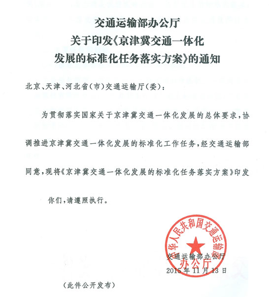 交通運(yùn)輸部辦公廳關(guān)于印發(fā)《京津冀交通一體化發(fā)展的標(biāo)準(zhǔn)化任務(wù)落實(shí)方案》的通知