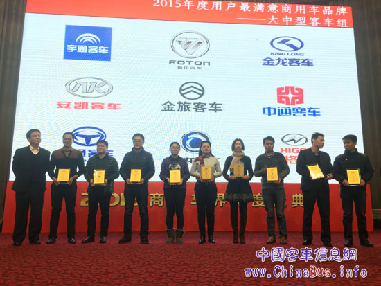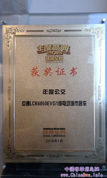 2016年1月15日,在北京舉行的“2015商用車界年度盛典”上,中通客車憑借2015年出色市場(chǎng)表現(xiàn)和良好市場(chǎng)反饋,贏得了用戶、活動(dòng)主辦方及業(yè)界人士的一致認(rèn)可,獲得兩項(xiàng)大獎(jiǎng)。其中,中通客車榮獲“2015用戶最滿意商用車品牌”稱號(hào),中通LCK6850EVG1純電動(dòng)城市客車則被評(píng)為2015年“年度公交”。
