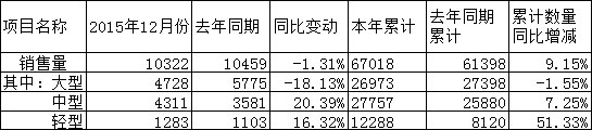 1月5日,宇通客車發(fā)布產銷數據顯示,公司2015年全年累計汽車銷量6.70萬輛,同比增長9.15%。其中,公司2015年12月實現汽車銷售量為10322輛,同比下降1.31%。