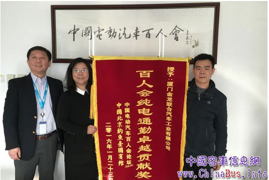 “謝謝!謝謝金龍客車優(yōu)秀服務(wù)保障團(tuán)隊(duì)提供的‘零排放’通勤服務(wù)!”1月28日,中國電動(dòng)汽車百人會(huì)國際部主任陳茂林、理事長(zhǎng)助理戴薇將一面鮮紅的錦旗交到了金龍客車輕客銷售部副經(jīng)理曾國偉手中并表達(dá)了感謝。“百人會(huì)純電通勤卓越貢獻(xiàn)獎(jiǎng)”金燦燦的幾個(gè)大字格外醒目,這是百人會(huì)組委會(huì)對(duì)金龍客車新能源通勤服務(wù)的高度認(rèn)可,也是一份金龍客車實(shí)至名歸的榮耀。