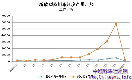 根據(jù)機動車輛出廠合格證統(tǒng)計,2016年1月純電動商用車生產(chǎn)2422輛,同比增長80%,插電式混合動力商用車生產(chǎn)834輛,同比下降4%。較之2015年年底月度產(chǎn)量,純電動商用車大幅度下滑,從近6萬輛水平滑至2000輛水平。