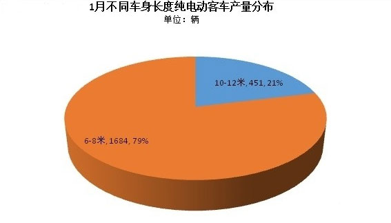 源于去年各大車企追逐政策紅利,加大對純電動客車車型的產(chǎn)能投放,整個商用車產(chǎn)量透支今年數(shù)據(jù);在下階段對純電動客車車型補貼政策的調整情況下,各大車企可能會對自己生產(chǎn)的純電動客車車型有所調整,但從1月數(shù)據(jù)統(tǒng)計看,分車身尺寸,6-8米純電動客車依舊占主力,產(chǎn)量達1684輛,占比延續(xù)去年全年走勢,達79%;而10-12米車型產(chǎn)量僅451輛,占比21%。