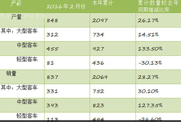 中通客車2016年3月4日晚間發(fā)布公告稱,公司2月銷售各類客車共計837輛,環(huán)比增長28.27%。生產(chǎn)各類客車848輛,環(huán)比增長26.17%。具體到車輛類型來看,2月份中通客車實現(xiàn)大型客車銷量331輛,同比增長30.10%;中型、輕型銷量分別為393輛、113輛,分別同比增長127.35%和同比下降26.60%。