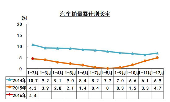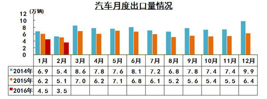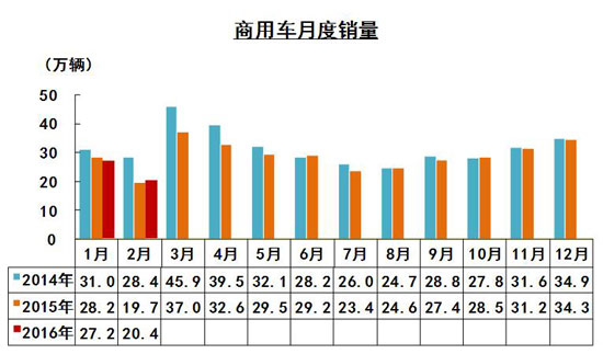 2016年1-2月份,汽車產(chǎn)銷406.91萬輛和408.69萬輛,同比增長3.74%和4.37%。其中,商用車產(chǎn)銷51.03萬輛和47.36萬輛,同比下降4.83%和0.96%,降幅比上年同期分別收窄11.34個(gè)百分點(diǎn)和18.53個(gè)百分點(diǎn)。
