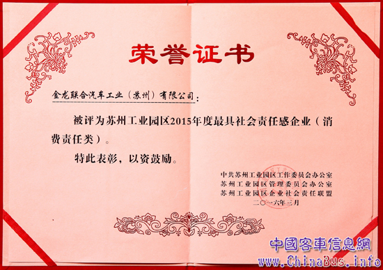 蘇州金龍獲評園區(qū)2015年度“最具社會責(zé)任感企業(yè)”
