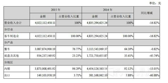 2015年,公司連續(xù)第六年實現(xiàn)客車銷量過萬,合計銷售各類客車10,017輛,同比下降4.18%;受控參股子公司主要經(jīng)營指標同比嚴重下滑的影響,合并銷售收入40.22億元,同比下降16.82%;得益于新能源客車銷量的大幅增加,歸屬于母公司所有者的凈利潤4,023.66萬元,同比增長70.95%。