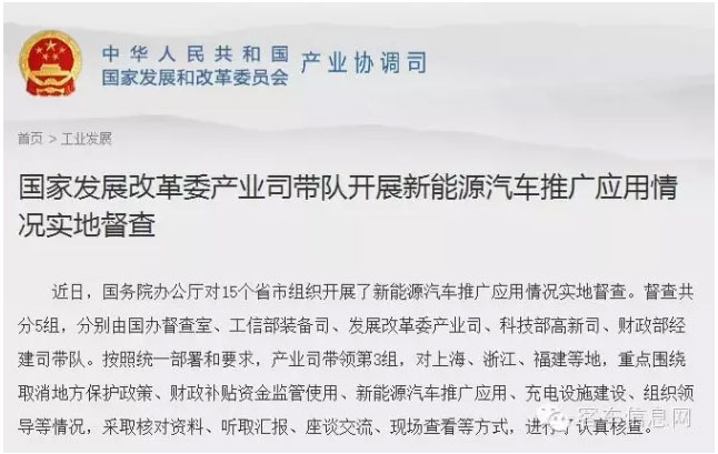 4月19日,國家發(fā)改委發(fā)布公告稱,近日,國務院辦公廳對15個省市組織開展了新能源汽車推廣應用情況實地督查。督查共分5組,分別由國辦督查室、工信部裝備司、發(fā)展改革委產(chǎn)業(yè)司、科技部高新司、財政部經(jīng)建司帶隊。