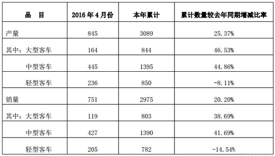 5月4日,安徽安凱汽車股份有限公司公布2016年4月份產(chǎn)銷數(shù)據(jù)。公告顯示,4月份安凱客車產(chǎn)銷分別為845輛和751輛。1-4月,安凱客車累計銷售各類客車2975輛,同比增長20.2%;累計生產(chǎn)各類客車3089輛,同比增長25.37%。