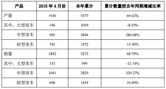 5月7日,中通客車控股股份有限公司發(fā)布截至 2016 年 4 月份產銷數據快報,快報顯示中通客車4月份總銷量為1892輛,同比增長68.79%,其中大型客車153輛,同比降低12.4%;中型客車1041輛,占總銷量的大半,同比增長320.27%;輕型客車698輛,同比增長10.49%。