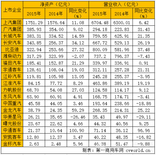 小編通過梳理各家企業(yè)年報發(fā)現(xiàn),2015年,我國汽車類上市企業(yè)凈資產(chǎn)整體上漲,統(tǒng)計的19家上市車企“身價”絕大多數(shù)有較快增長,上汽、長城、長安、比亞迪、福田、宇通、江鈴、力帆、中通、金龍等企業(yè)的凈資產(chǎn)增幅都超過了兩位數(shù)。