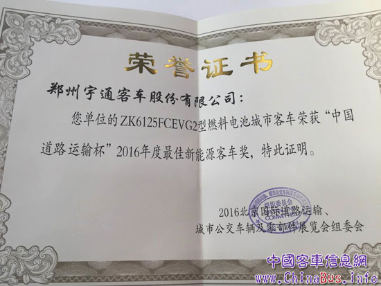 宇通燃料電池客車榮獲中國(guó)道路運(yùn)輸杯2016年度最佳新能源客車獎(jiǎng)