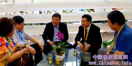 金龍汽車集團(tuán)董事長(zhǎng)黃莼(左三)與廈門(mén)金龍旅行車有限公司總經(jīng)理葉宏廷(右二)與客戶親切交談