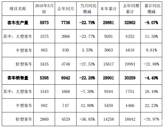 6月7日,廈門金龍汽車集團股份有限公司發(fā)布2016 年 5 月份產(chǎn)銷數(shù)據(jù)快報,快報顯示金龍客車5月份總銷車5395輛,同比降低22.28%,其中大型客車1543輛,同比降低7.38%,中型客車992輛,同比增加32.8%,輕型客車2820輛,同比36.85%。