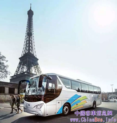 比亞迪研發(fā)的世界首臺純電動(dòng)旅游客車在巴黎艾菲爾鐵塔的見證下亮相歐洲