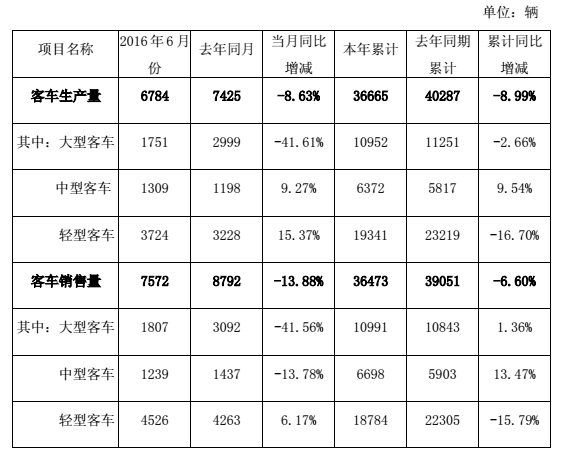 廈門金龍汽車集團(tuán)股份有限公司2016年6月份客車產(chǎn)銷數(shù)據(jù)快報如下: