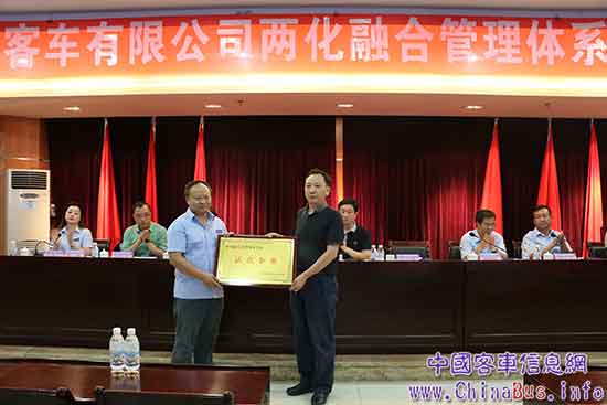 重慶市經(jīng)濟信息委易小獻處長為恒通客車授予“兩化融合管理體系貫標試點企業(yè)”榮譽。
