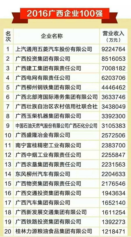 據(jù)了解,2016廣西企業(yè)100強(qiáng)的入圍門檻有了較大幅度提高,達(dá)到13.82億元;2016廣西100強(qiáng)企業(yè)營(yíng)業(yè)收入總額保持增長(zhǎng),達(dá)到10387.10億元。百?gòu)?qiáng)企業(yè)對(duì)廣西經(jīng)濟(jì)社會(huì)發(fā)展的貢獻(xiàn)依然顯著,營(yíng)業(yè)收入總額與全區(qū)生產(chǎn)總值比值達(dá)到61.82%,對(duì)廣西公共財(cái)政預(yù)算收入的貢獻(xiàn)達(dá)49.46%。