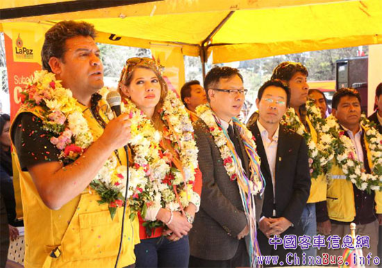 拉巴斯市長Luis(左一)宣布第四條公交線路正式開通