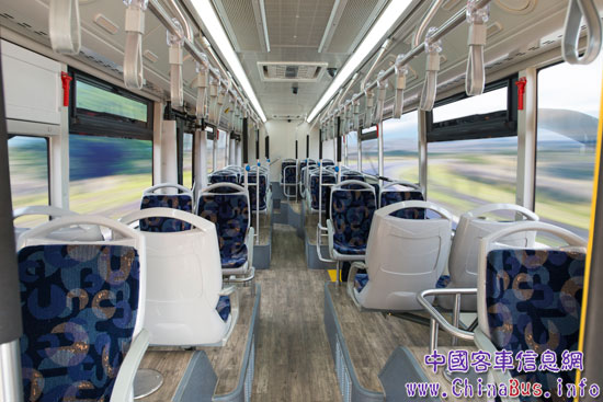 作為漢諾威展的首發(fā)車型,新車型定位在12米純電動系列,采用三門全通低地板結構。設計人員巧妙地將車廂離地高度縮小至340mm以內(nèi),這較國內(nèi)新能源客車的車廂離地高度(一般小于360mm)降低了20mm左右。這樣一來,方便乘客上下車,并有效地擴展了車內(nèi)空間,提高了車輛的運載能力。