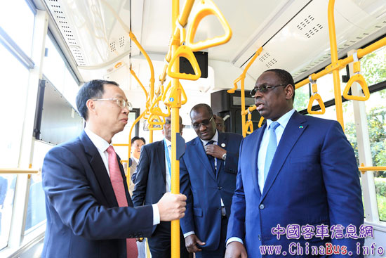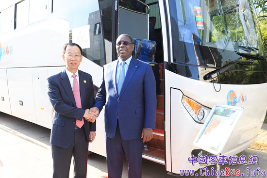 塞內(nèi)加爾總統(tǒng)薩勒與蘇州金龍總經(jīng)理黃書平在海格客車前合影