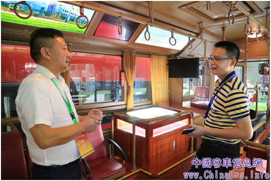 中國(guó)道路運(yùn)輸協(xié)會(huì)城市客運(yùn)分會(huì)理事長(zhǎng)張國(guó)光(右一)為仿古鐺鐺車舒適的乘坐體驗(yàn)點(diǎn)贊