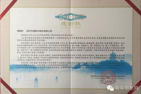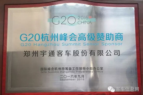同樣在9月28日,杭州市委、市政府,杭州市交通運輸局聯(lián)合召開G20杭州峰會總結(jié)表彰大會,表彰了為峰會服務(wù)保障工作作出突出貢獻的先進集體和個人。其中,宇通客車被授予“G20杭州峰會高級贊助商”榮譽稱號, T7被授予“G20杭州峰會指定產(chǎn)品”榮譽稱號。