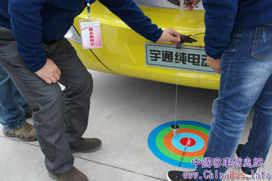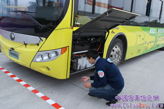 選手對(duì)宇通E10純電動(dòng)車進(jìn)行出車?yán)龣z