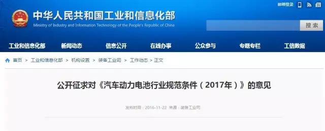 為貫徹落實《國務(wù)院關(guān)于印發(fā)節(jié)能與新能源汽車產(chǎn)業(yè)發(fā)展規(guī)劃(2012-2020年)的通知》(國發(fā)〔2012〕22號)、《國務(wù)院辦公廳關(guān)于加快新能源汽車推廣應(yīng)用的指導(dǎo)意見》(國辦發(fā)〔2014〕35號),按照研究建立車用動力電池準(zhǔn)入管理規(guī)定的要求,2015年3月我部制定發(fā)布了《汽車動力蓄電池行業(yè)規(guī)范條件》。根據(jù)動力電池發(fā)展情況和新能源汽車市場需要,我們近期組織研究討論,形成了《汽車動力電池行業(yè)規(guī)范條件(2017年)》(征求意見稿),現(xiàn)公開征求社會意見。如有意見或建議,請于2016年12月22日前以書面或電子郵件形式反饋至我部裝備工業(yè)司。