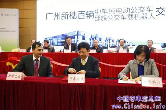 交付儀式現(xiàn)場,中車時代電動、廣州新穗巴士、廣州部落科技簽訂了三方戰(zhàn)略合作協(xié)議,旨在共同推進廣州市智能綠色公共交通的發(fā)展。