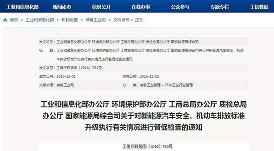 12月2日,工業(yè)和信息化部辦公廳、環(huán)境保護部辦公廳、工商總局辦公廳、質(zhì)檢總局辦公廳、國家能源局綜合司五個部門聯(lián)合發(fā)布《關于對新能源汽車安全、機動車排放標準升級執(zhí)行有關情況進行督促檢查的通知》,對于督查內(nèi)容、方式及時間安排進行了詳細說明。