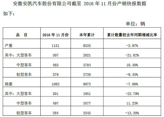 12月6日,安徽安凱汽車股份有限公司發(fā)發(fā)布2016年11月份產(chǎn)銷數(shù)據(jù)快報??靾箫@示,11月份安凱銷售各類客車1082輛,1-11月累計銷售各類客車8073輛,同比下降7.00%。其中,11月大型客車銷量為301輛,1-11月累計銷量為1051輛,同比下降22.79%;11月中型客車銷量為497輛,1-11月累計銷量為3577輛,同比增長11.23%;11月輕型客車銷量為284輛,1-11月累計銷量為2545輛,同比下降13.38%。