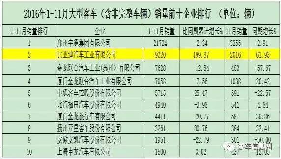 在這其中,無論是從11月單月看還是累計從1-11月看其銷量成績,比亞迪都穩(wěn)居大型客車企業(yè)銷售排名榜單第二名席位,其同比增量更是奪人眼球,相比去年同期其當月同比增長61.93%,同比累計增長近200%(實際為199.87%)。就同比漲幅而言,比亞迪在大型客車企業(yè)中是前11個月累計漲幅最大的企業(yè)。