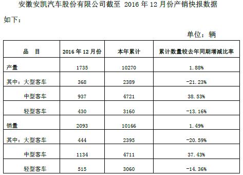 附件:安徽安凱汽車(chē)股份有限公司關(guān)于2016年12月份產(chǎn)銷(xiāo)情況的自愿性信息披露公告