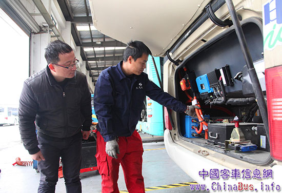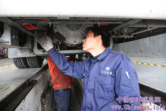 1月12日下午,蘇汽客運服務(wù)站服務(wù)工程師走進蘇州汽車客運西站,對站內(nèi)5輛客運車輛進行檢查?!澳壳拔覀兎?wù)站一共有70輛車在活動范圍內(nèi)。根據(jù)不同的車況,每輛車需要安全檢查的時間40~60分鐘不等?!狈?wù)工程師游淵峰說,因為白天車輛要上路運營,所以他們一般會在下午下班后主動上門服務(wù),經(jīng)常加班到晚上11點?!肮ぷ鬟@么長時間,每年春運營期間都會有蘇州金龍服務(wù)站工程師來做維保檢查,”有著10年中短途客運駕駛經(jīng)驗的張師傅說,“春運期間客流密集,客運站都是加班加點安排班次,車輛都是高負荷運行,有你們對車輛進行體檢和服務(wù),我們送旅客回家才更安心!”