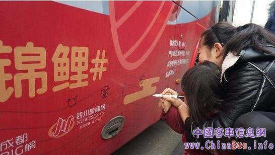 上午,巴士從寬窄巷子出發(fā),搭載著游客,一路行經(jīng)天府廣場(chǎng)、IFS等成都市著名地標(biāo),最后抵達(dá)熊貓基地。汽車穿行在成都中心城區(qū),成為一條流動(dòng)的風(fēng)景線,一路吸引不少市民關(guān)注。大家紛紛拿起手機(jī),抓拍這輛“錦鯉巴士”,分享到個(gè)人社交平臺(tái)。來(lái)自重慶的游客劉先生笑著說(shuō),“這輛‘錦鯉巴士’還挺有意思的。我本來(lái)只是隨便逛一逛,沒(méi)想到跟它不期而遇。這是新年好兆頭,希望好運(yùn)可以一直延續(xù)”?!拔覀兂啥脊皇怯袀€(gè)有愛(ài)的城市,這個(gè)巴士有創(chuàng)意?!背啥际忻褡T小姐按下朋友圈的分享鍵后說(shuō)道。不一會(huì)兒,她發(fā)布在微信朋友圈上的“錦鯉巴士”照片,就得到幾十位好友點(diǎn)贊?!坝信笥堰€留言問(wèn)‘在哪里可以偶遇’,他們也要來(lái)抓拍錦鯉,祈求好運(yùn)氣?!痹趯捳镒?,不少游客在“錦鯉巴士”上簽字留言,許下新年愿望。